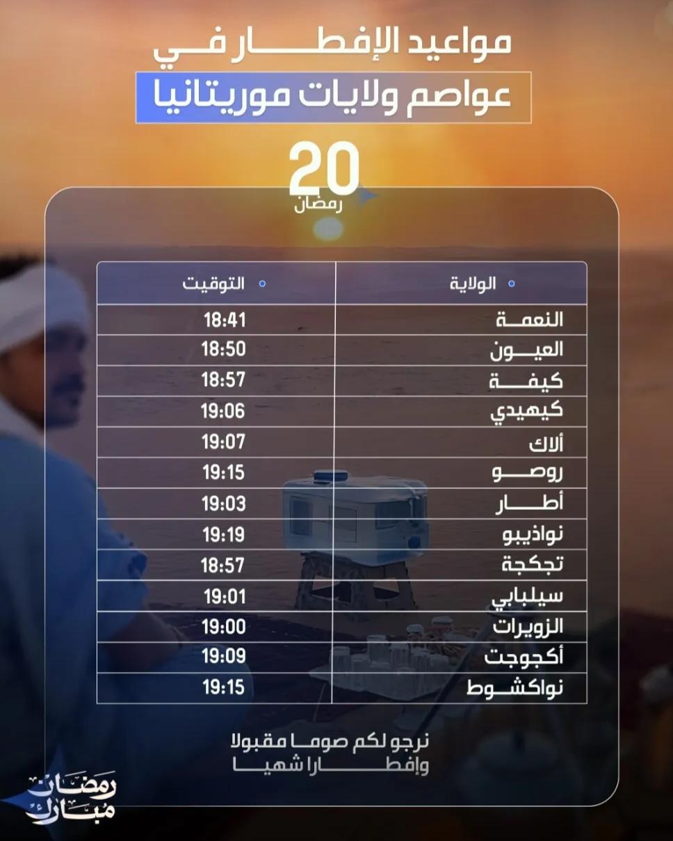 أوقات إفطار اليوم الـ20من رمضان في عموم موريتانيا