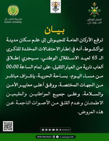 هنأ الوزير الأول المختار ولد اجاي الشعب الموريتاني بمناسبة الذكرى الخامسة والستين للاستقلال الوطني، وذلك في تدوينة نشرها على حسابه الرسمي في فيسبوك.