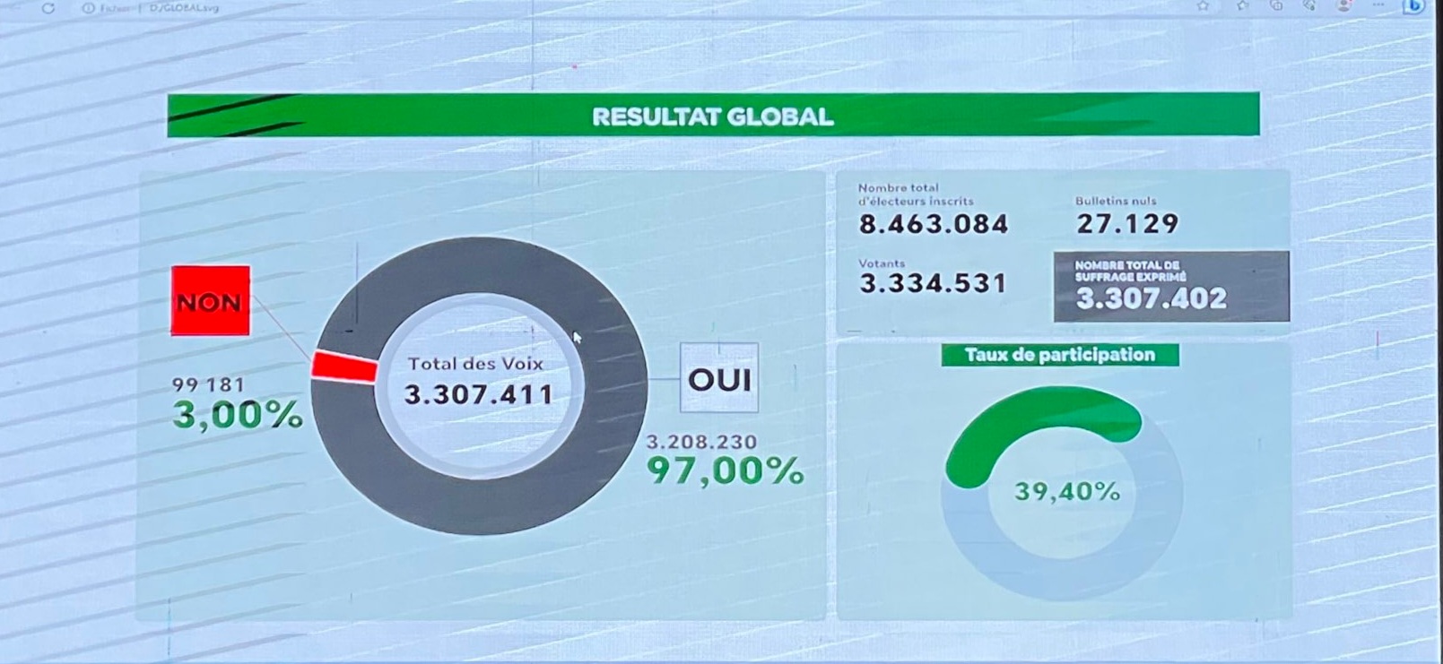 وأوضحت السلطة المستقلة لتدبير الانتخابات، أن نسبة 3% من المصوتين، عارضوا الدستور الجديد، وأن نسبة المشاركة بلغت 39.40%.