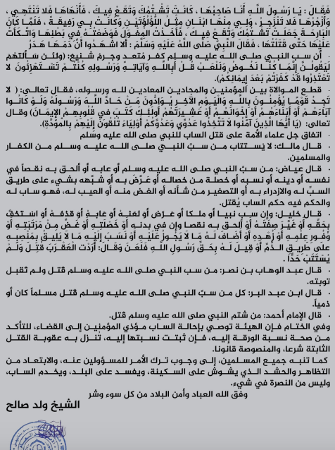 وجاء في بيان صادر عن الهيئة أن عقوبة قتل ساب النبي محمد صلى الله عليه وسلم ثابتة شرعا ومنصوصة قانونا، مستعرضة أقوال العلماء التي تؤكد أنه لا يستتاب ولا تقبل توبته.