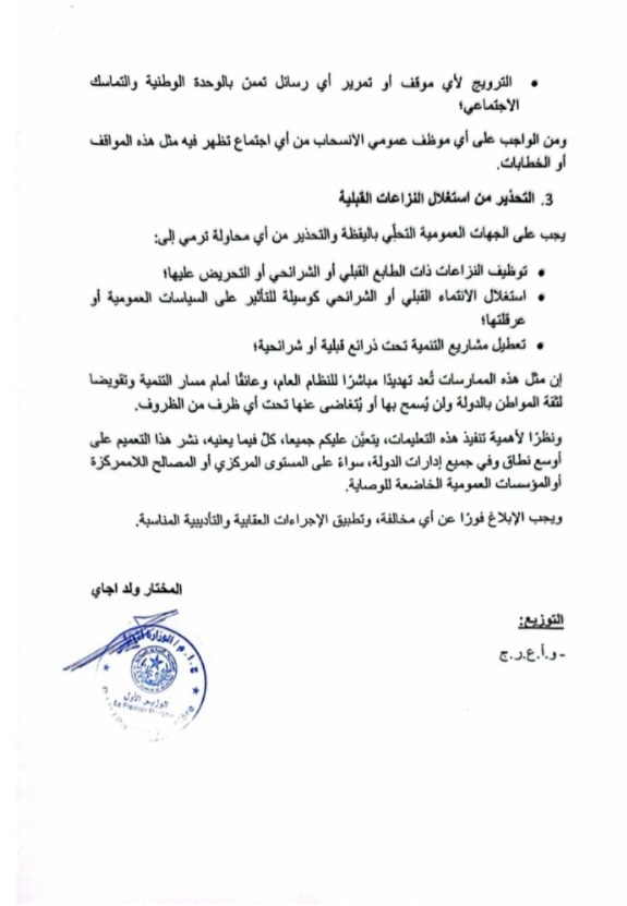 وأكد ولد اجاي في التعميم الصادر عنه أنه يتعين على موظفي الدولة ووكلائها الالتزام بالتعليمات المتعلقة بحظر الاجتماعات ذات الطابع الطائفي أو القبلي أو الجهوي، مشددا على أنه يجب عليهم الامتناع عن المشاركة في أي اجتماع أو تجمع أو نشاط ذي طابع طائفي أو قبلي أو جهوي، والانسحاب فورا من أي اجتماع ظهرت محاولات استغلاله كمنصة لذلك.