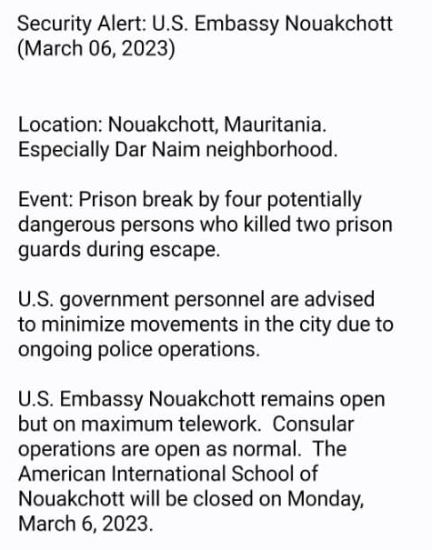 أغلقت كل من الثانوية الفرنسية والمدرسة الأمريكية في نواكشوط أبوابها صباح اليوم الاثنين 06 مارس 2023، وذلك بعد ساعات من فرار سجناء سلفيين من السجن المركزي.