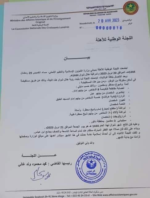 أعلنت اللجنة المركزية لمراقبة الأهلة في بيان أصدرته قبل قليل في نواكشوط، ثبوت رؤية هلال شهر شوال للعام الهجري 1444.