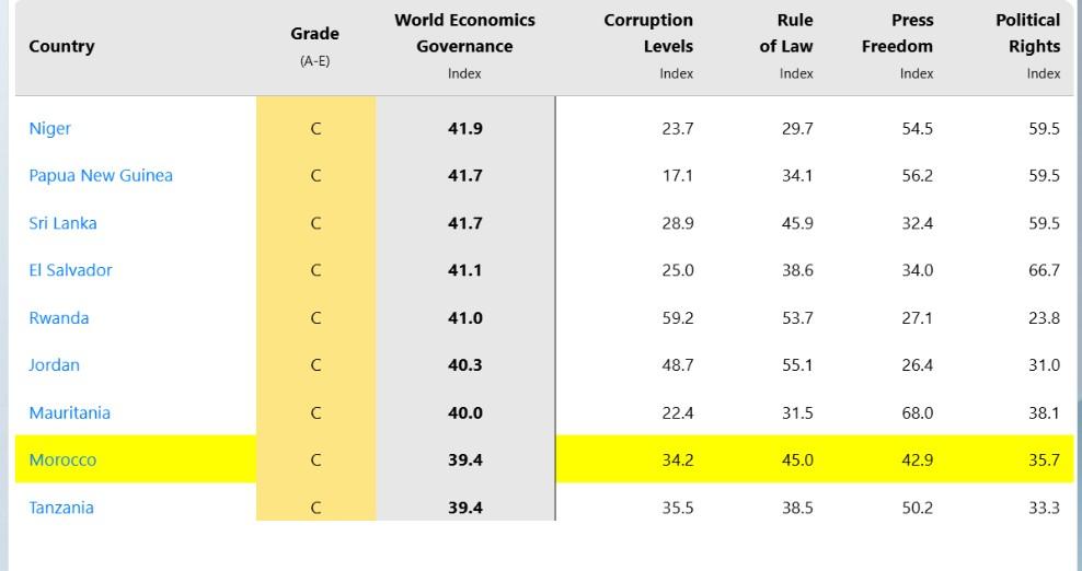 وتعتبر هذه الفئة هي الشريحة الوسطى عالميا للدول التي تحقق أداء مقبولا دون بلوغ المراتب المتقدمة، حيث حصلت المملكة على 40.0 نقطة فقط وفق سلم التنقيط المعتمد من صفر إلى مائة ضمن مؤشر الحكامة العالمي.