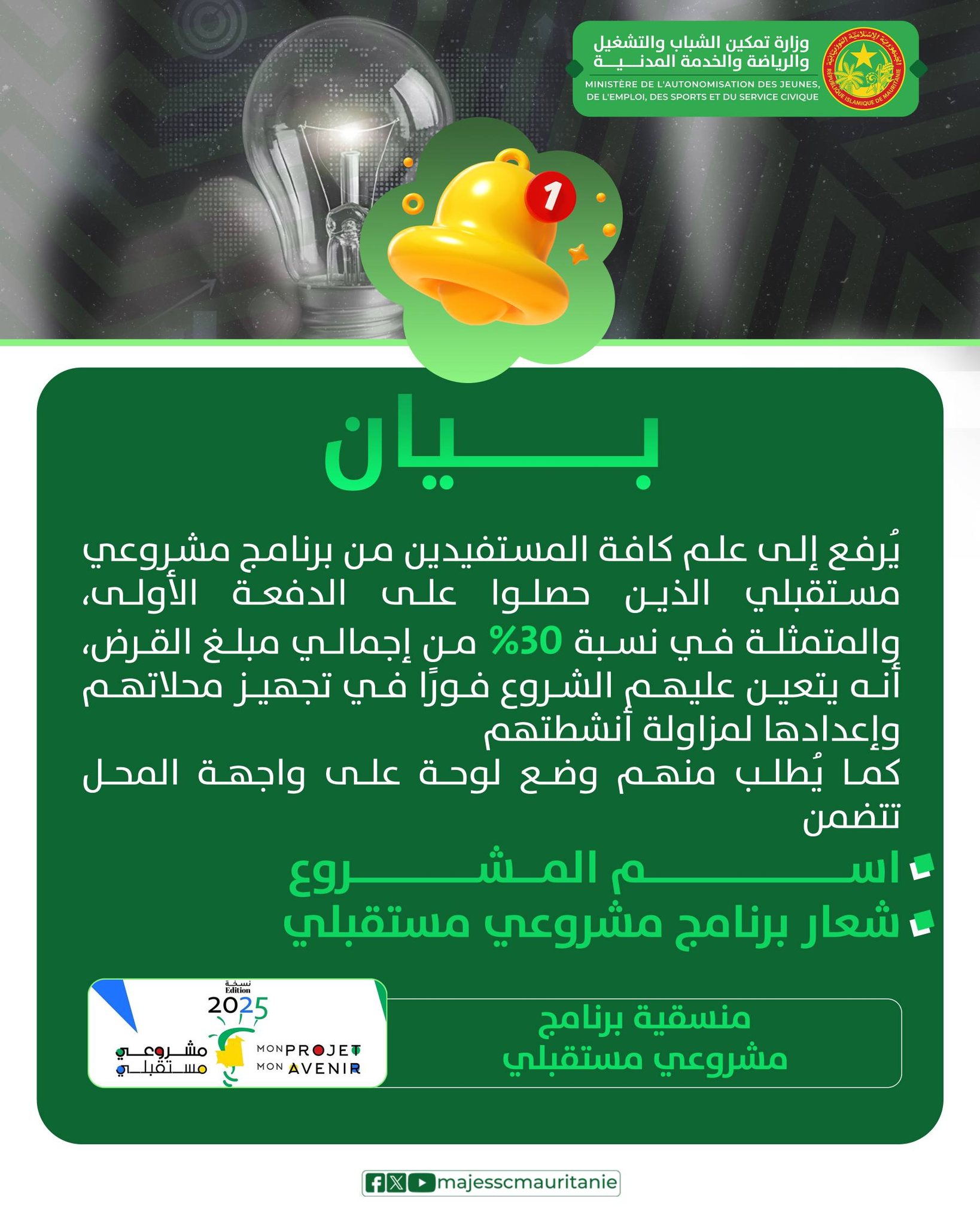 دعت وزارة تمكين الشباب والتشغيل والرياضة والخدمة المدنية المستفيدين من برنامج مشروعي مستقبلي الحاصلين على النسبة الأولى من القرض إلى تجهيز محلاتهم فورا لمزاولة أنشطتهم طبقا لنص البلاغ التالي: