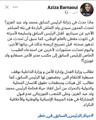 1- حالة الرئيس السابق محمد ولد عبد العزيز مستقرة ويستفيد فى كل وقت وعند الطلب والضرورة من حقه فى الكشف الطبي و الرعاية الصحية اللازمة دون أية مشكلة.