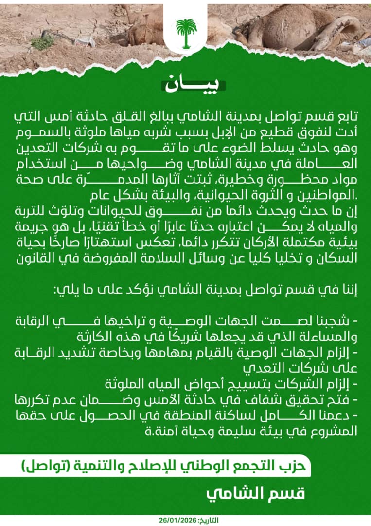 طالب حزب التجمع الوطني للإصلاح والتنمية (تواصل) بفتح تحقيق في نفوق قطيع من الإبل في منطقة الشامي بولاية داخلت نواذيبو.