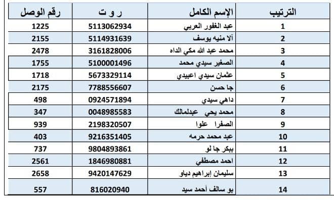 تطلب الأركان العامة للجيوش /فرقة التكوين من الشباب الموريتانيين الناجحين في مسابقة الاكتتاب المباشر للطلبة الضباط العاملين للسنة الدراسية 2023 -2024 المبينة أسماؤهم في اللائحة أدناه الالتحاق بالأركان العامة للجيوش/ فرقة التكوين، يوم 16-10-2023 الساعة الثامنة صباحا مصحوبين بملفاتهم للبدء في إجراءات الإكتتاب.