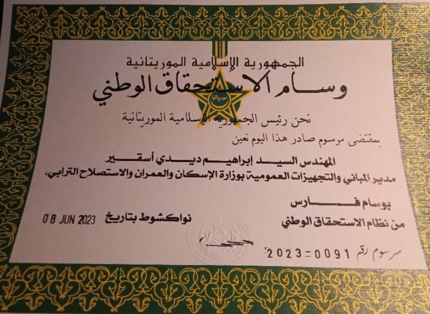 وشح وزير الإسكان والعمران والاستصلاح الترابي سيدي أحمد ولد محمد الجمعة باسم الرئيس محمد ولد الشيخ الغزواني، مدير المباني والتجهيزات العمومية بالوزارة المهندس إبراهيم ولد اسقير بوسام فارس من نظام الاستحقاق الوطني.