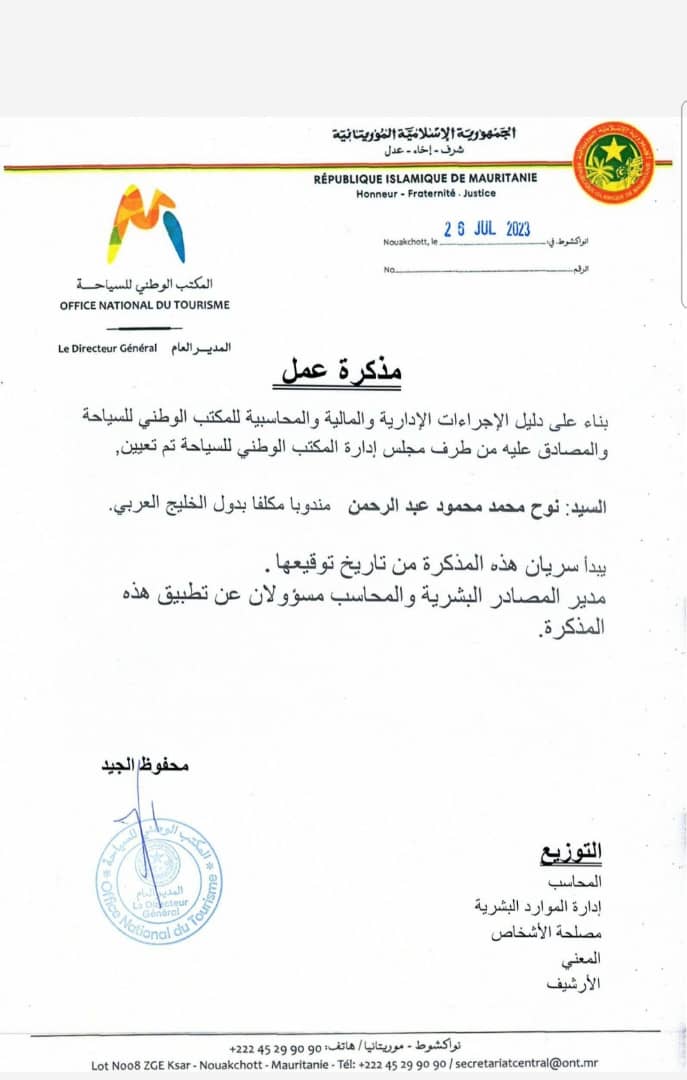 بموجب قرار صادر عن المدير العام للمكتب الوطني للسياحة السيد محفوظ ولد اجيد تم تعيين السيد نوح محمد محمود مندوبا مكلفا بدول الخليج العربي بالمكتب الوطني للسياحة.
