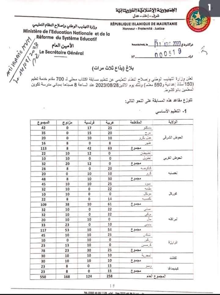 أعلنت وزارة التهذيب الوطني وإصلاح النظام التعليمي رسميا عزمها اكتتاب 700 مقدم خدمة تعليم. وتتوزع المقاعد على عدة مقاطعات بمختلف ولايات الوطن، بين مدرس بالعربية وآخر بالفرنسية ومدرس مزدوج. التفاصيل