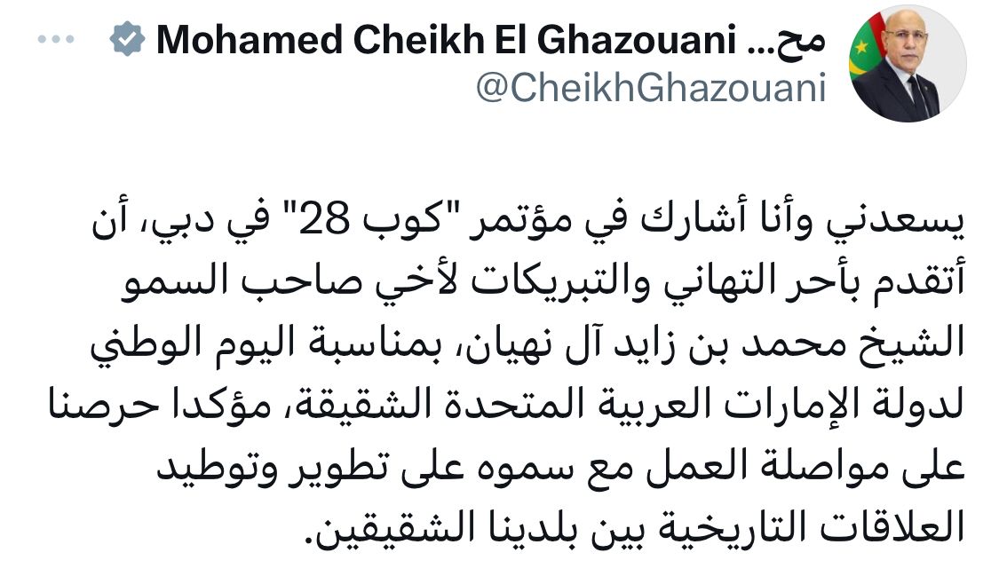 نشر الرئيس محمد ولد الشيخ الغزواني على صفحته بموقع “اكس” تغريدة هنأ فيها صاحب السمو الشيخ محمد بن زايد آل نهيان، رئيس دولة الإمارات العربية المتحدة، بمناسبة اليوم الوطني لبلاده.