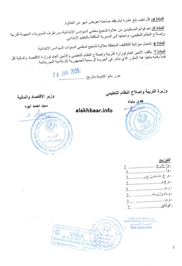 وقعت وزيرة التربية وإصلاح النظام التعليمي، هدى بنت باباه، ووزير الاقتصاد والمالية سيدي أحمد ولد ابوه، مقررا مشتركا يقضي بمنح علاوة تشجيعية من 20 ألف أوقية قديمة، لصالح مدرسي الأقسام السوادس الابتدائية، وهي العلاوة التي أعلن عنها الرئيس محمد ولد الغزواني خلال خطابه في ذكرى الاستقلال الماضية.