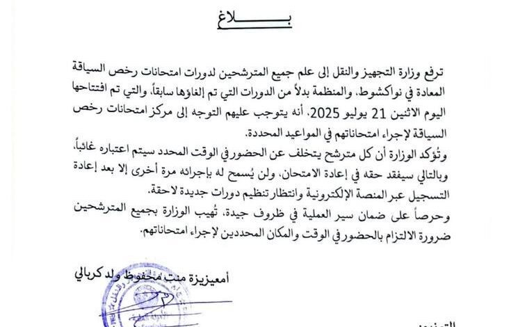 أعلنت وزارة التجهيز والنقل، أن دورات امتحانات رخص السياقة المعادة، المنظمة في نواكشوط بدلاً من الدورات الملغاة سابقًا، قد انطلقت صباح الإثنين، 21 يوليو 2025.