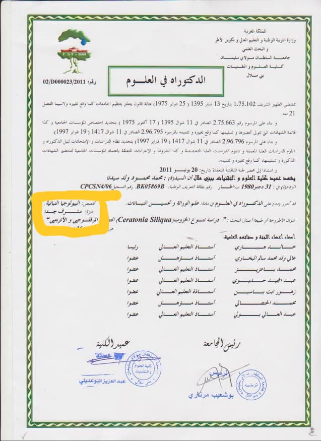 محمد محمود ولد سيدين حاصل على شهادة دكتوراه في العلوم البيولوجية تخصص : البيولوجيا النباتية’ بتقدير مشرف جدا منذ 2011 من المملكة المغربية نشرت أربعة بحوث علمية في مجلات محكمة دوليا وشاركت في أزيد من 35 مؤتمر دولي ووطني لعرض نتائج الأبحاث العلمية والأكاديمية ولدي خبرة 10 سنوات في التدريس في مؤسسات التعليم العالي خصوصا المعهد العالي للتعليم التكنولوجي بروصو والمدرسة العليا للتعليم بنواكشوط وكلية العلوم والتقنيات بجامعة نواكشوط العصرية درست خلالها أكثر من 544 ساعة من الدروس النظرية والأعمال التوجيهية والتطبيقية للطلاب في مستويات ليصانص والمستر.