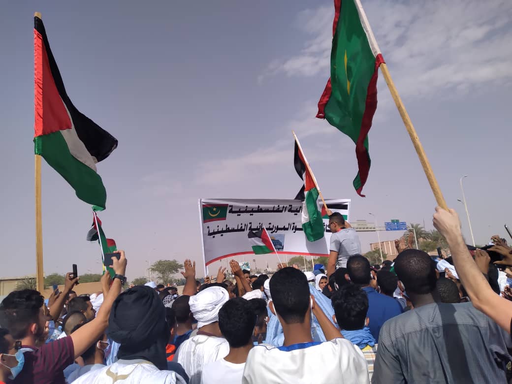 وانطلق آلاف الأشخاص من جامع ابن عباس متوجهين إلى مقر الأمم المتحدة وسط العاصمة نواكشوط، ورفع بعض المتظاهرين العلم الوطني الموريتاني، والعلم الفلسطيني.