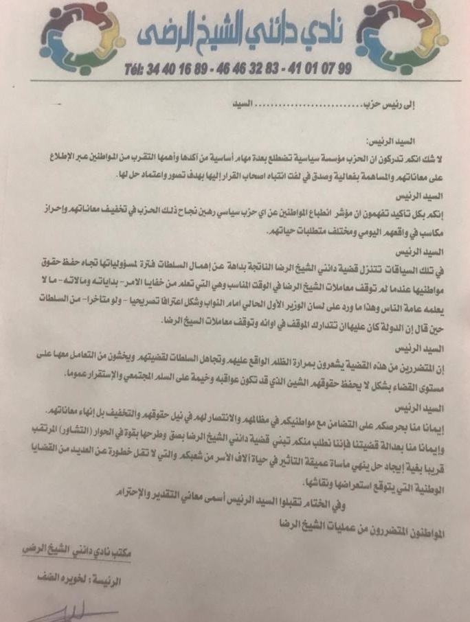 قالت السيدة لخوير منت الضف المتحدثة باسم مكتب دائني الشيخ الرضا في تصريح جديد لها انه في اطار حراك مكتب دائني الشيخ الرضا من أجل استرجاع حقوقهم كاملة من جهة و الرامي الى لفت السلطات العليا الى مأساتهم من جهة أخري ،نظمت مجموعة الدائنين سلسلة نشاطات شملت لقاءات مع الاقطاب السياسية موالاة ومعارضة وذلك من أجل اقناعهم بضرورة اثارة قضيتهم في جلسات الحوار المرتقب، حيث شملت تلك اللقاءات حزب الاتحاد من أجل الجمهورية واحزاب معارضة .