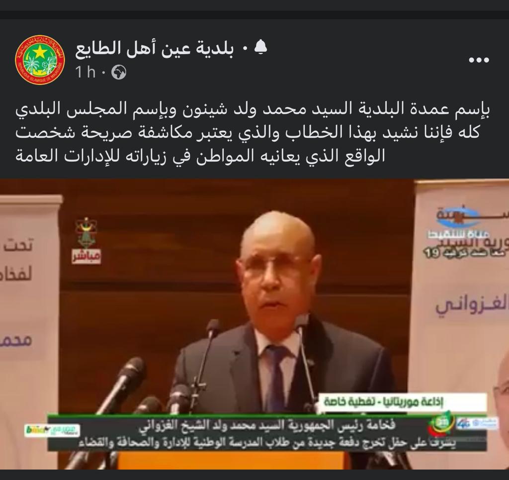 وقال في تدوينة اجري له بالمناسبة : " بإسم عمدة البلدية السيد محمد ولد شينون وبإسم المجلس البلدي كله فإننا نشيد بهذا الخطاب والذي يعتبر مكاشفة صريحة شخصت الواقع الذي يعانيه المواطن في زياراته للإدارات العامة.