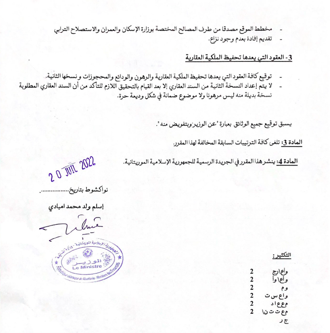 ويمثل توقيع المقرر المذكور عودة للوضع السابق والذي تم التراجع عنه بموجب مقرر من وزير المالية السابق محمد الأمين ولد الذهبي خلال يناير الماضي، تزامنا مع إيفاد تفتيش إلى الإدارة العامة للعقارات وأملاك الدولة، على خلفية الحديث عن فساد واختلالات وتلاعب بالقطع الأرضية.