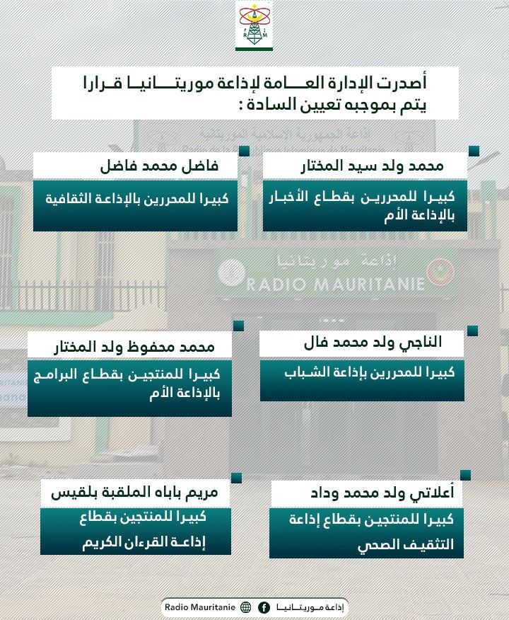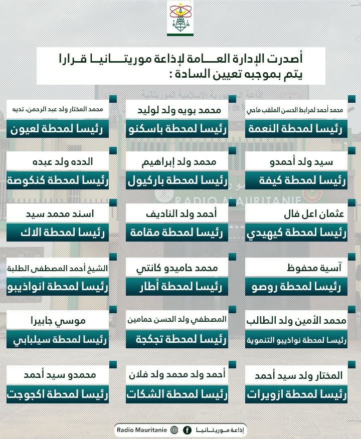 وشمل التغيير أغلب المحطات الجهوية للإذاعة وتصعيد كوكبة من خيرة صحفي الإذاعة الشباب كفاءات وقيما أخلاقية ، وعراقة في السلوك المهني والنضج في وسائط التواصل الاجتماعي ، وجدير بالذكر أن طاقم الإذاعة الجديد سيعلن عن مكونته الأخيرة لاحقا، والتي تضم رؤساء مصالح مركزية في مختلف القطاعات بالاذاعة العامة والإذاعات المتخصصة و قد ضخت فيها دماء شابة ومتعددة الكفاءات من رسميين ومتعاونين لأول مرة .