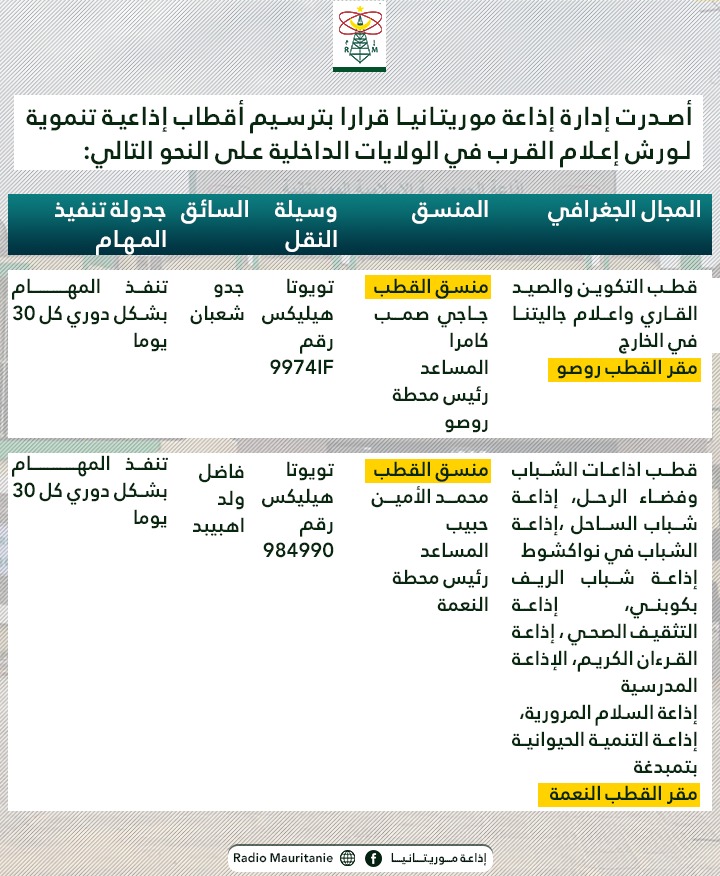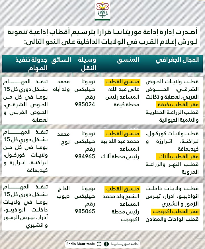 تدعيما لورش اعلام القرب ، التي تجوب ثمان بعثات إذاعية الآن في جميع ولايات الوطن ل15لإجراء مسح شامل عن الحملة الزراعية المطرية والمروية في تلك الربوع، أصدر المدير العام لإذاعة موريتانيا السيد محمد الشيخ ولد سيد محمد ، اليوم الخميس1سبتمبر2022 .